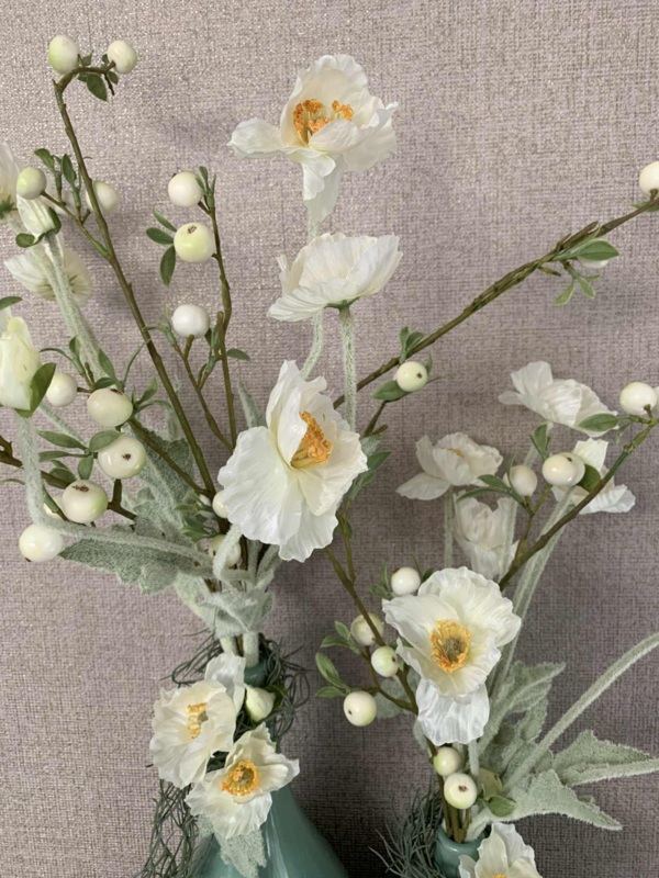 OverzichtWatergroene vaas gevuld met witte poppy's, appeltak en grijze tillandsia.