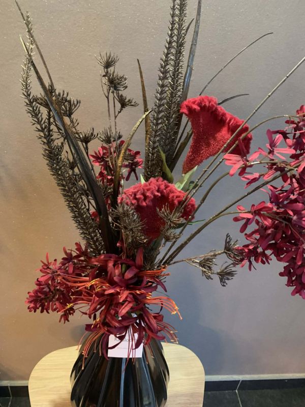 Bronzen vaas met bordeau bloemen en bronzen pluimen