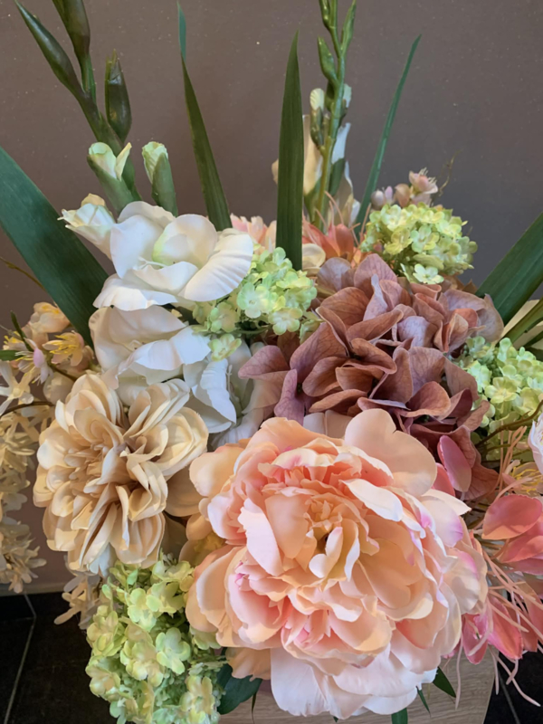 OverzichtGlazen lila vaas gevuld met groene viburnum, zalme pioenen, witte gladiolen, beige lilium, roze cleome, roze hortensia, beige dahlia, zalme bloesem