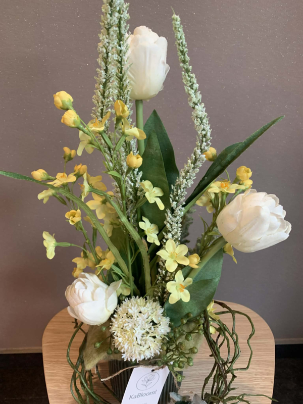 Fleurig lentestuk met witte tulpen, gele stephanotis, creme aliumbollen, witte en groene pluimgrassen, wilgentak en groene besjes en groene vilt.