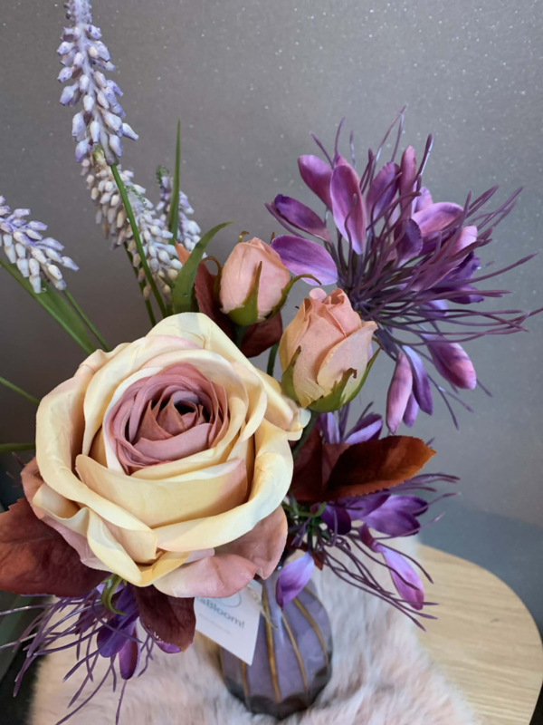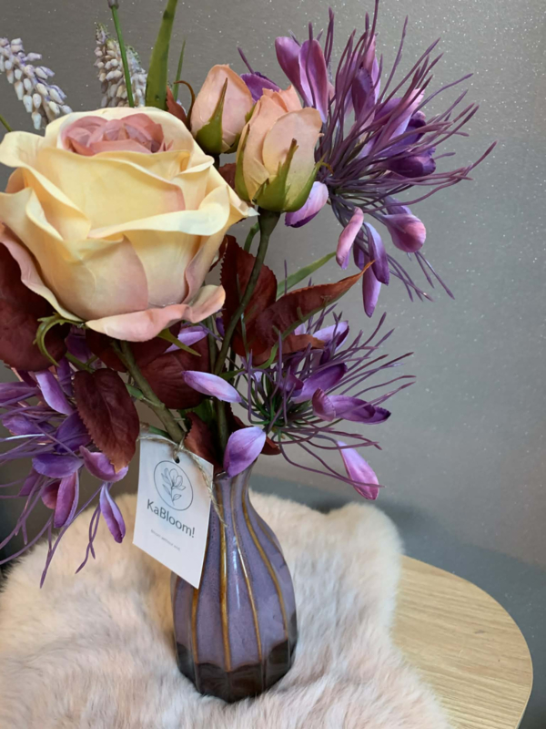 Tof vaasje kleur bordeaux, mauve met ribbels gevuld met zalme roos, lichtpaarse muscari en paarse cleome.