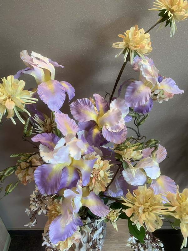 OverzichtSpeciale geribbelde vaas grijs/ mauve gevuld met geel/paarse irissen, geel, zalme zinnia, wit/bruine afhangende bloesem en krulhazelaar.