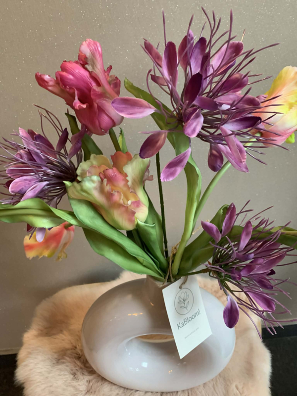 OverzichtLichtpaarse ronde vaas met opening in het midden gevuld met roze/mauve papegaaitulpen en lila cleome.