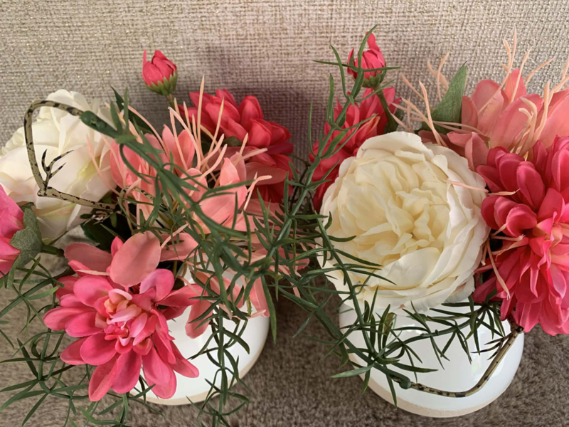 Creme tulpvaas met onderaan beige ruwe rand gevuld met felroze dahlia, roze cleome, creme pioen en fijne asparagus.