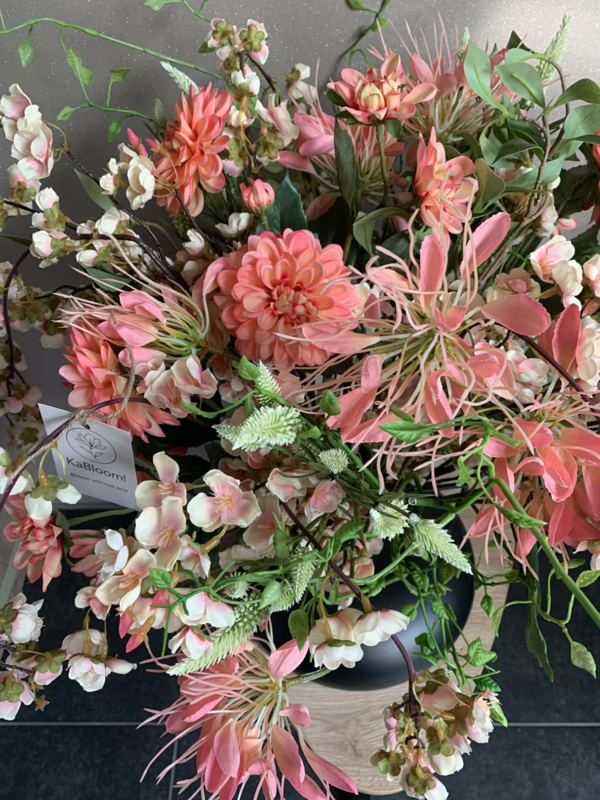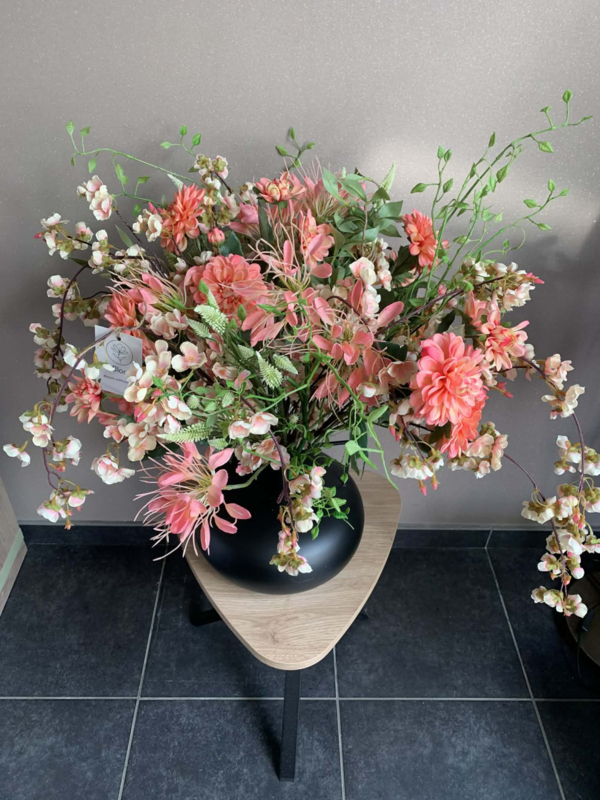 Zwarte metalen vaas met handvat gevuld met koraalroze dahlia, cleome, zalme bloesem, groene hoya, witte trifolium gevuld met groen.