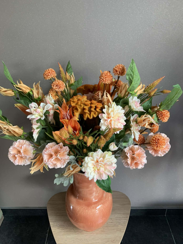 Hippe oranje metalen vaas met oranje/zalm/groen boeket