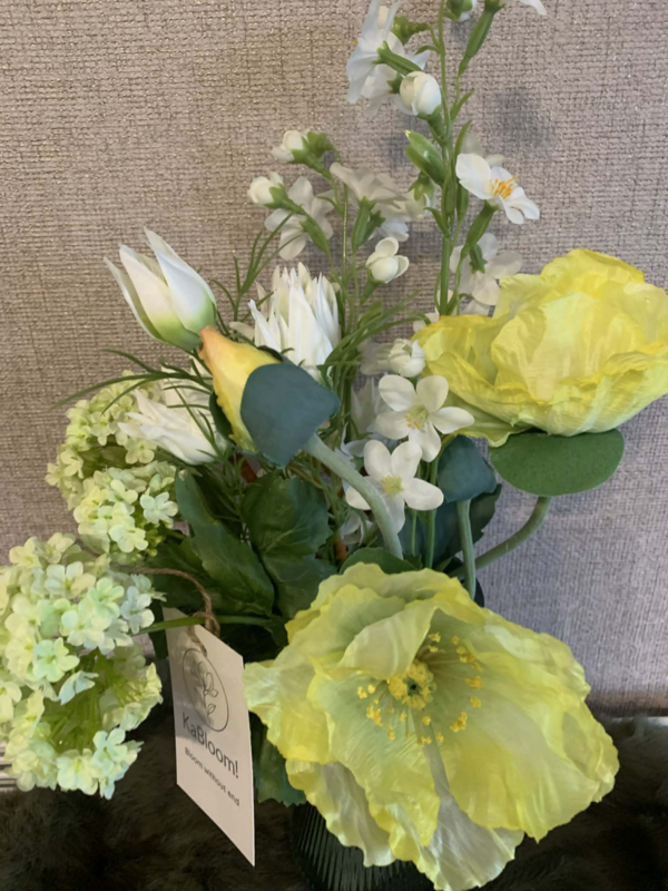 Groene geribbelde vaas gevuld met geel/groene papaver, groene viburnum, witte protea, witte stephanotis.
