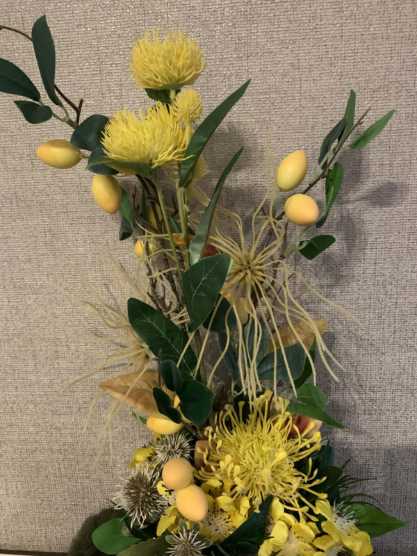 Oker/gele tulpvormige cachepot gevuld met gele olijftak, gele nutan, gele bloesem, beige distel, okergele clematis en fijn groen.