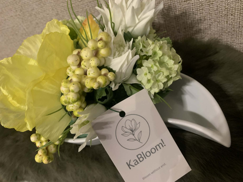 Druppelvormig wit schaaltje gevuld met groen/gele papaver, groene viburnum, witte protea, groene besjes.