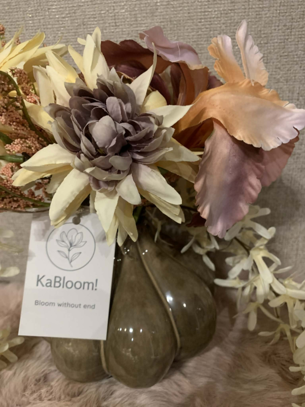 Bruine pompoenvormige vaas gevuld met beige lilium, zalm/bruine iris, creme scabiosa, zalme astilbe, dahlia beige/mauve.