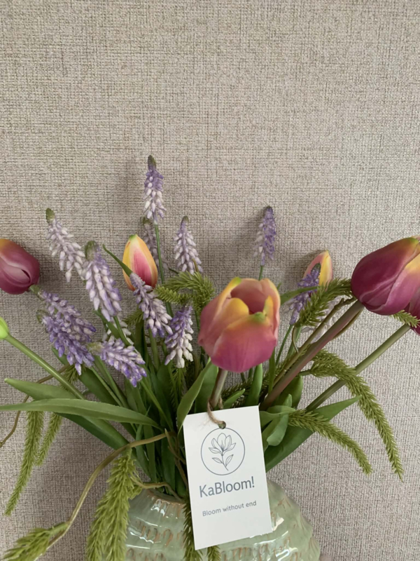 Ovaalgroene vaas met realtouch tulpen, muscari, asparagus