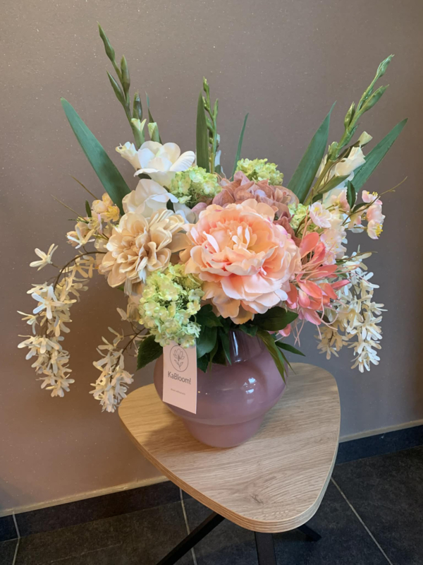 Glazen lila vaas gevuld met groene viburnum, zalme pioenen, witte gladiolen, beige lilium, roze cleome, roze hortensia, beige dahlia, zalme bloesem Hoogte: 60 cm Breedte: 60 cm
