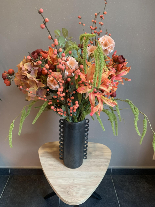 Grijze speciale vaas gevuld met oranje hortensia, oranje nerine, rode trosroosjes, zalme ilex, zalme scabiosa, en groene amaranthus. Hoogte: 60 cm Breedte: 60 cm