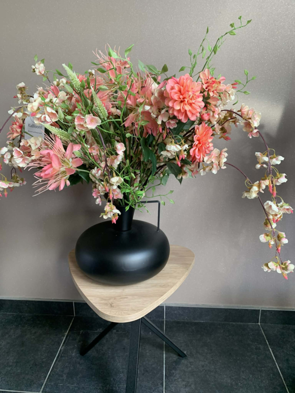 Zwarte metalen vaas met handvat gevuld met koraalroze dahlia, cleome, zalme bloesem, groene hoya, witte trifolium gevuld met groen. Hoogte: 70 cm Breedte: 70 cm
