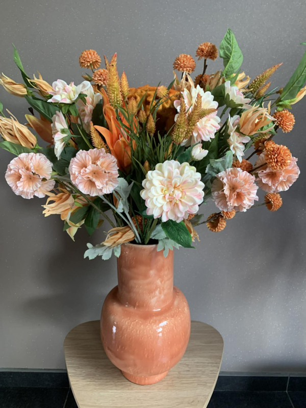 Hippe oranje, metalen vaas gevuld met oranje lelie's, pompons, oranje trifolium, celosia, zalme dahlia, zalme scabiosa., groen met oranje vruchtjes. Hoogte: 70 cm Breedte: 70 cm